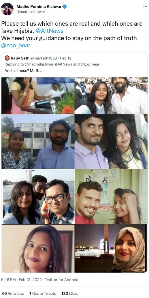 Amid hijab-wearing students disallowed from attending classes in Karnataka educational institutions, Madhu Kishwar quote-tweeted multiple images of a woman named Najma Nazeer that showed her both with and without a hijab. It was insinuated that Nazeer usually does not adorn a hijab but wears it to college to push an ‘agenda’.