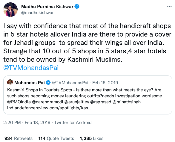 In February 2019, while replying to a user about Kashmiri shops, she tweeted that most handicraft shops in 5-star hotels in India provide cover to “jihadi” groups. She then wrote, “Strange that 10 out of 5 shops in 5 stars, 4-star hotels tend to be owned by Kashmiri Muslims. [sic]”