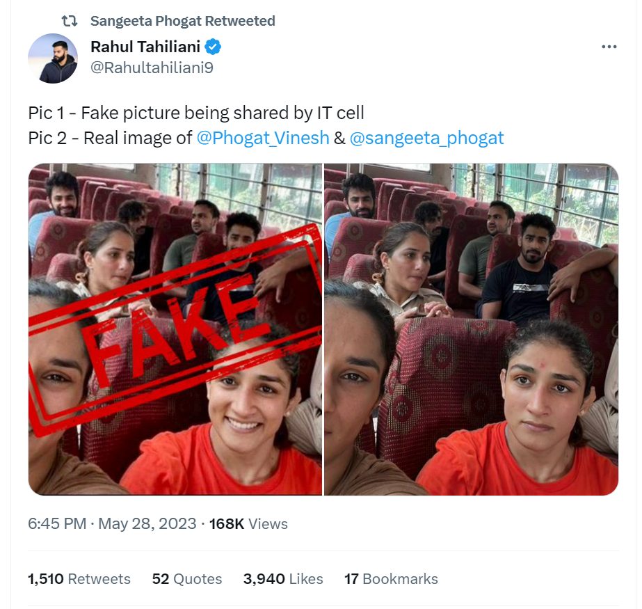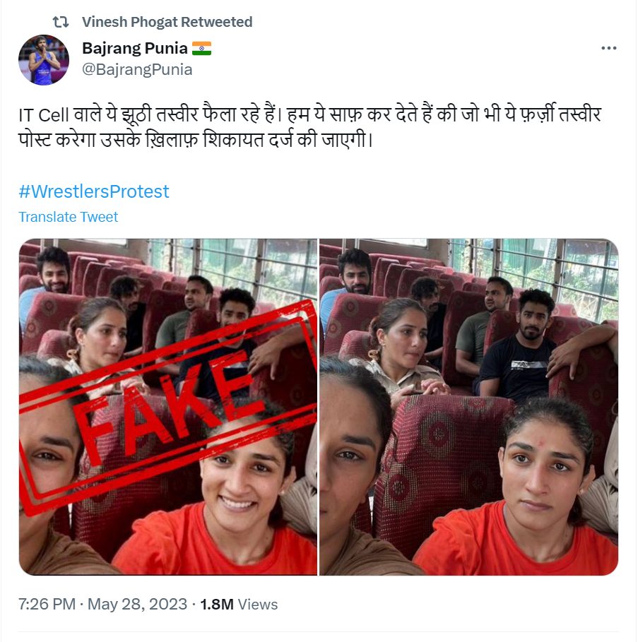 Wrestler Bajrang Punia tweeted a collage of the two photos (in one, the wrestlers are smiling; in the other, they are not) marking the viral image as ‘fake’. He stated that complaints would be filed against whoever circulated the viral image. This particular tweet was retweeted the Vinesh Phogat herself.