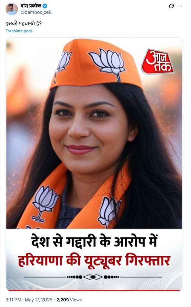 Recently, Jyoti Malhotra, a YouTuber from Hisar, Haryana, was arrested by the NIA on charges of spying for Pakistan and sharing sensitive information. Meanwhile, two pictures of Malhotra wearing BJP and Aam Aadmi Party election caps and scarves are viral on social media. The pictures also have the logo of Aaj Tak news channel. Many users are sharing it on social media believing it to be true.