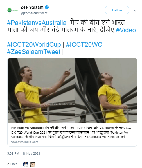 Fact-checking portal Boomlive had also published a report on the video. To sum it up, Zee Salaam falsely shared a 10-month-old video linking it to the recent Australia-Pakistan T20 World Cup match.